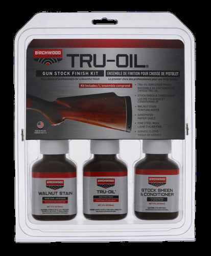 Kit includes: 3 fl. Oz. Tru-oil® gun stock finish, 3 fl. Oz. Walnut stain, 3 fl. Oz. Stock sheen & conditioner, and fine, medium and coarse sandpaper.